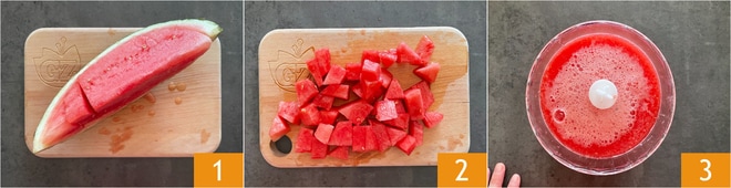 Pour préparer le sorbet à la pastèque avec blancs d'œufs, prenez la pastèque 1, éliminez la peau et découpez 600 g de pulpe (si vous le souhaitez, vous pouvez déjà retirer tous les pépins) en cubes 2. À l'aide d'un mixeur, mixez la pulpe 3.
