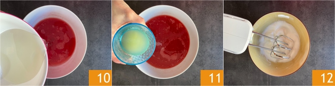 Après le temps de refroidissement, ajoutez à la pulpe de pastèque le sirop de sucre 10 et le jus de citron 11. Montez les blancs d'œufs en neige ferme 12.