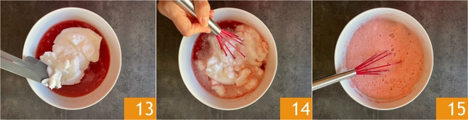 Incorporez-les au mélange de pastèque 13 et mélangez bien à l'aide d'un fouet 14, vous devez obtenir un mélange homogène 15.