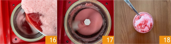 Versez le mélange bien froid dans la sorbetière 16 et laissez turbiner jusqu'à obtenir un sorbet crémeux 17, cela prendra environ 20-30 minutes. Servez le sorbet à la pastèque avec blanc d'œuf bien froid et dégustez-le immédiatement.