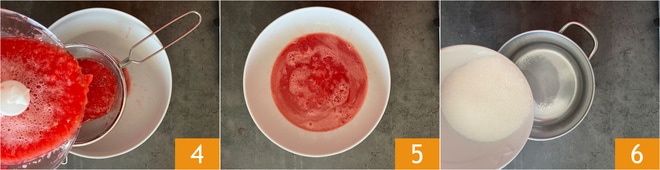 Passez-la au tamis 4, afin de ne récupérer que la partie liquide 5. Maintenant, consacrez-vous à la préparation du sirop de sucre : versez dans une casserole l'eau et le sucre 6.