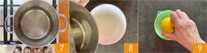 Portez à ébullition jusqu'à ce que le sucre soit dissous 7. Transférez le sirop dans un bol et laissez refroidir. Ensuite, placez au réfrigérateur, pendant au moins une demi-heure, tant le sirop que la pulpe de pastèque, afin qu'ils deviennent bien froids. Après le temps nécessaire, pressez un citron avec le presse-agrumes 9 et filtrez-en le jus.