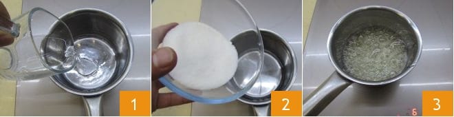 Pour réaliser le sorbet au citron sans blancs d'œufs, versez 200 g d'eau 1 dans une casserole, ajoutez 200 g de sucre 2, mélangez et portez à ébullition : vous obtiendrez un sirop plutôt liquide. Laissez bouillir pendant 3 minutes 3, puis mettez à refroidir au réfrigérateur pendant au moins 30 minutes.