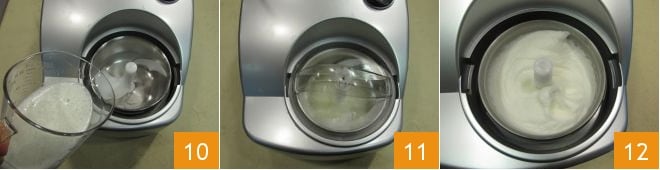 Versez le mélange obtenu dans le bol de la sorbetière préalablement refroidie (suivez les instructions de votre sorbetière pour savoir comment procéder) 10. Laissez turbiner le sorbet pendant environ 30-40 minutes 11 jusqu'à un refroidissement complet. Une fois que vous avez obtenu une crème lisse et brillante 12, votre sorbet est prêt à être servi!