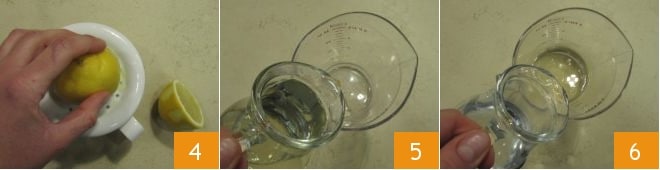 Pressez le citron pour obtenir 100 g de jus 4 et filtrez-le. Dans un pichet, versez 315 g de sirop d'eau et de sucre désormais froid 5, 85 g d'eau 6