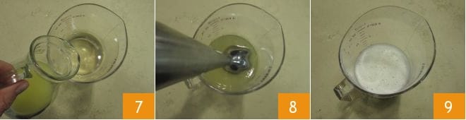 et le jus de citron 7. Émulsionnez le mélange avec un mixeur plongeant 8 jusqu'à obtenir un mélange clair et mousseux 9.