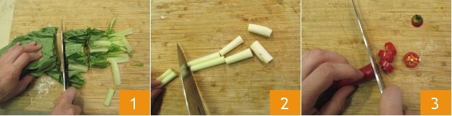 Pour réaliser la soupe avec boulettes de porc et gingembre, commencez par faire bouillir l'eau dans une grande casserole, puis passez à la préparation des ingrédients pour le bouillon. Lavez les blettes, éliminez la partie finale des tiges et coupez-les grossièrement en morceaux 1. Lavez les bâtons de citronnelle, retirez les extrémités et coupez-les également en morceaux assez grands 2. Enfin, lavez le piment et coupez-le en rondelles 3.