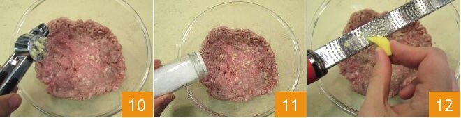 Pendant ce temps, vous pouvez préparer les boulettes : mettez la viande hachée de porc dans un grand bol, ajoutez la gousse d'ail écrasée 10, du sel 11, du poivre, le gingembre râpé 12
