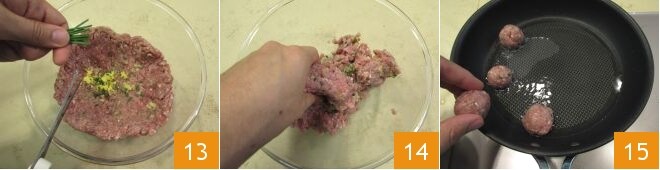 et la ciboulette finement coupée 13, puis mélangez le tout avec vos mains 14 et formez des boules d'environ 3 cm de diamètre. Chauffez l'huile de graines dans une poêle, disposez les boulettes à l'intérieur 15
