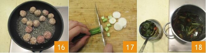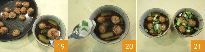 puis ajoutez environ 4 boulettes par personne 19 et garnissez de ciboule fraîche 20. Votre soupe avec boulettes de porc et gingembre est prête à être dégustée bien chaude 21 !
