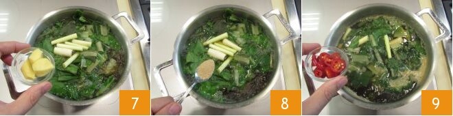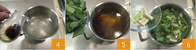 Lorsque l'eau arrive à ébullition, ajoutez la sauce soja 4, les blettes 5, la citronnelle 6,