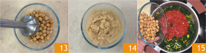 Pendant que le chou noir flétrit légèrement, mixez la moitié des pois chiches avec un peu d'eau 13 pour obtenir une crème 14. Ajoutez les pois chiches entiers dans la casserole 15.