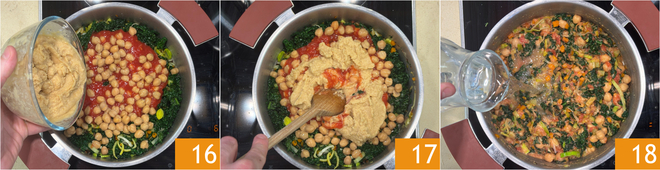 Ajoutez également la crème de pois chiches 16 et mélangez bien pour tout amalgamer 17. Couvrez avec le bouillon de légumes 18 et continuez la cuisson à feu moyen pendant environ 20 minutes.