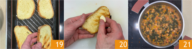 Pendant que la soupe cuit, grillez les tranches de pain des deux côtés sur une grille 19, puis frottez-les avec une gousse d'ail 20. Une fois le temps de cuisson écoulé, la soupe sera dense et consistante 21.
