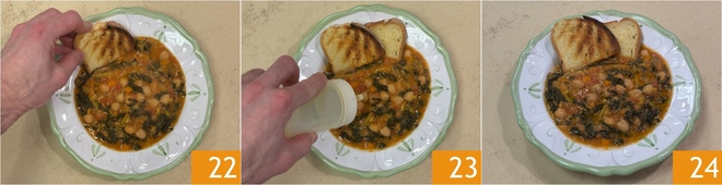 Complétez chaque assiette avec une tranche de pain grillé 22, un filet d'huile 23 et un tour de moulin à poivre. Votre soupe de chou noir est prête à être dégustée 24 !