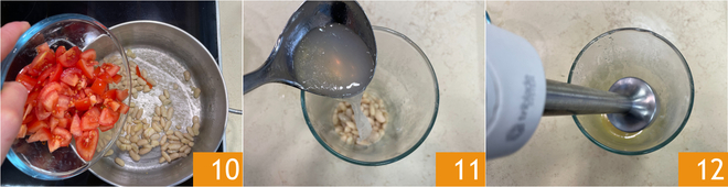 Ajoutez les tomates coupées dans la poêle 10 et faites cuire 2–3 minutes à feu doux. Pendant ce temps, versez environ 500 g d'eau des moules dans le bol 11 et mixez 12 pour obtenir une crème.
