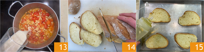 Versez la crème de haricots dans la poêle et poursuivez la cuisson pendant environ 20 minutes, afin de laisser un peu réduire le liquide 13. Entre-temps, tranchez le pain 14 et assaisonnez avec de l'huile et du sel 15.