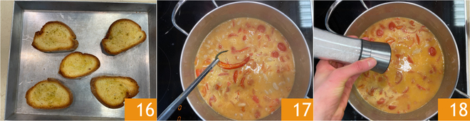 Faites griller les tranches de pain au four à 200 °C pendant 6–7 minutes 16. Une fois la cuisson de la soupe terminée, retirez l'ail et le piment 17, puis rectifiez l'assaisonnement en sel 18.
