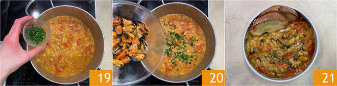 Coupez le feu et garnissez de persil haché 19. Enfin, ajoutez les moules décortiquées 20 et mélangez bien. Servez votre soupe de haricots et de moules accompagnée des croûtons de pain 21 !