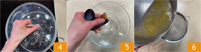 Couvrez-les immédiatement et attendez quelques minutes pour qu'elles s'ouvrent 4. Lorsqu'elles sont toutes ouvertes, décortiquez-les 5 et filtrez le jus de cuisson 6. Réservez. Coupez les tomates en quatre.