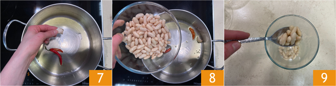 Dans une autre casserole, faites chauffer l'autre moitié de l'huile avec le piment coupé en deux et l'ail 7, ajoutez les haricots, salez et laissez-les s'imprégner à feu doux pendant environ 6–7 minutes 8. Prélevez la moitié des haricots et transférez-les dans le bol du mixeur 9.