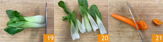 Entre-temps, préparez les légumes: retirez la base du pak choi 19 et séparez les feuilles 20, puis épluchez les carottes et coupez-les en tranches obliques 21.