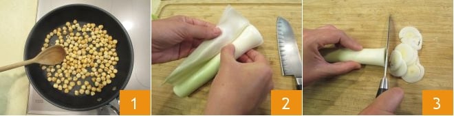 Pour réaliser la soupe de panais et noisettes, commencez par préparer le bouillon de légumes en suivant notre recette et gardez-le au chaud. Faites griller les noisettes dans une poêle pendant quelques minutes pour qu'elles libèrent tout leur arôme 1, mais n'oubliez pas de les surveiller souvent pour éviter qu'elles ne brûlent. Nettoyez le poireau en enlevant à la fois la racine et la partie verte, puis retirez les feuilles les plus externes 2 et coupez-le en fines rondelles 3.