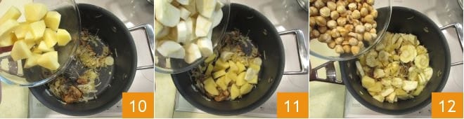 À ce stade, ajoutez également les pommes de terre 10, le panais 11 et les noisettes, en en réservant quelques-unes pour la garniture finale 12.