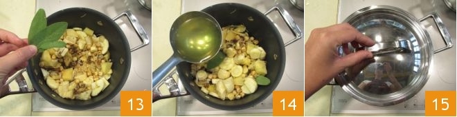 Ajoutez les feuilles de sauge préalablement lavées 13 et couvrez à hauteur avec le bouillon de légumes 14, puis fermez avec le couvercle 15 et faites cuire à feu doux pendant environ 30 minutes, en ajoutant plus de bouillon si nécessaire et en remuant de temps en temps.