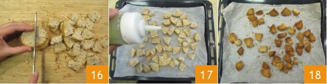 Entre-temps, vous pouvez vous occuper des croûtons : coupez le pain aux céréales d'abord en tranches, puis en cubes 16, disposez-les sur une plaque recouverte de papier sulfurisé et assaisonnez-les avec de l'huile 17 et du sel. Faites dorer les croûtons dans un four statique préchauffé à 200° pendant environ 8 minutes 18.