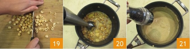 Hachez grossièrement les noisettes que vous avez mises de côté pour la garniture 19. Une fois le temps de cuisson de la soupe écoulé, retirez les feuilles de sauge et mixez avec un mixeur plongeant 20 ; si nécessaire, vous pouvez ajouter un peu de bouillon pour atteindre la consistance désirée. À ce stade, ajustez l'assaisonnement en sel et poivre 21 et servez la soupe dans les assiettes.