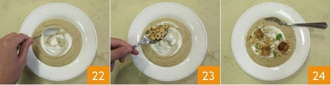 Pour finir, garnissez chaque assiette avec une cuillère à café de crème fraîche 22, un peu de noisettes hachées 23 et une poignée de croûtons : votre soupe de panais et noisettes est prête à être savourée 24!