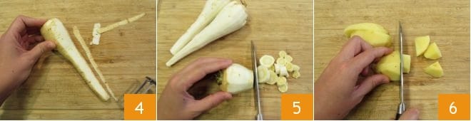 Épluchez le panais avec un économe 4 et coupez-le en cubes pas trop petits 5. Faites de même avec les pommes de terre 6.