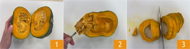 Pour préparer la soupe de potimarron et lentilles, commencez par réaliser le bouillon de légumes et gardez-le au chaud. Pendant ce temps, nettoyez le potimarron : divisez-le en deux 1 et enlevez les graines et les filaments internes 2. Enlevez la peau avec un couteau aiguisé, puis coupez la chair en tranches épaisses 3.