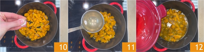 Salez 10 et versez une louche de bouillon de légumes chaud 11, couvrez avec le couvercle 12 et portez à ébullition ; cela prendra environ 10 minutes.