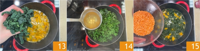 À ce stade, ajoutez le chou noir 13, mélangez et versez encore un peu de bouillon pour permettre aux feuilles de mijoter lentement 14. Ajoutez ensuite les lentilles rouges préalablement rincées 15. Allongez avec une autre louche de bouillon, mélangez et faites cuire pendant environ 15-20 minutes, ou jusqu'à ce que tous les légumes soient tendres.