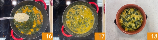 Pour donner du corps et une consistance plus crémeuse, incorporez une cuillère de farine de pois chiches 16. Continuez la cuisson encore quelques minutes, en mélangeant bien : vous verrez que la soupe deviendra dense et veloutée 17. Quand elle est prête, servez la soupe de potimarron et lentilles chaude dans un bol, en complétant avec un filet d'huile crue et, si vous le souhaitez, une pincée de poivre noir 18!