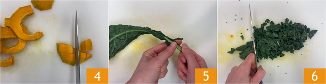 Enfin, coupez-le en petits cubes réguliers 4. Passez au chou noir : détachez les feuilles de la tige centrale 5 et hachez-les grossièrement avec un couteau 6.