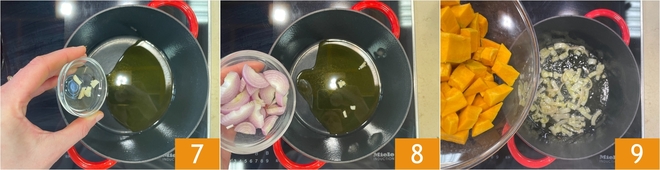 Dans une grande casserole, chauffez un filet d'huile d'olive extra vierge avec une gousse d'ail en morceaux 7 et l'échalote grossièrement hachée 8. Laissez mijoter doucement pendant 4-5 minutes. Ajoutez ensuite l'échalote en morceaux 8, puis ajoutez le potimarron 9.