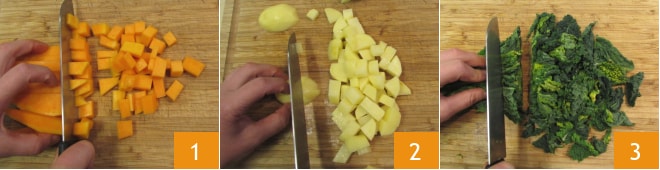 Pour réaliser la soupe vide-frigo, commencez par préparer les légumes : nettoyez la courge et coupez-la en morceaux 1, vous aurez besoin d'environ 500 g de pulpe, puis pelez les pommes de terre et coupez-les également en dés 2. Coupez le chou noir en lanières 3.