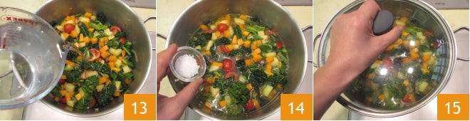 À ce stade, versez l'eau qui doit couvrir les légumes 13, ajoutez le gros sel 14, couvrez avec un couvercle 15 et faites cuire à feu doux pendant environ 40 minutes ou jusqu'à ce que les légumes soient cuits.
