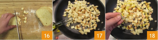 Pendant ce temps, occupez-vous des croûtons : coupez le pain en cubes 16, mettez-les dans une poêle déjà chaude et assaisonnez avec de l'huile 17, du sel et de l'origan 18.