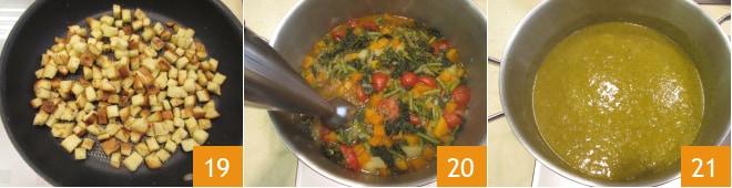 Faites griller les croûtons jusqu'à ce qu'ils soient bien dorés 19, puis mettez-les de côté. Quand les légumes sont cuits, mixez la soupe avec un mixeur plongeant 20 pour obtenir une consistance homogène 21.