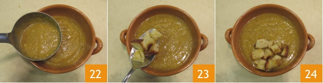Versez la soupe de légumes dans les assiettes 22, ajoutez les croûtons 23 et assaisonnez avec un filet d'huile crue : votre soupe vide-frigo est prête à être servie bien chaude 24 !