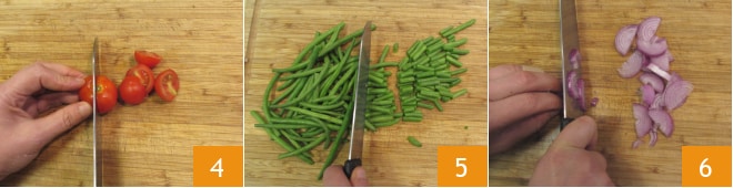 Coupez les tomates cerises en deux 4, puis équeutez les haricots verts et coupez-les en 2 ou 3 parties 5. Enfin, épluchez l'oignon et émincez-le finement 6.