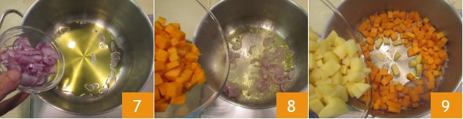 Chauffez un filet d'huile dans une grande casserole, ajoutez l'oignon 7 et laissez-le mijoter quelques minutes. Ajoutez la courge 8 et mélangez, puis ajoutez les pommes de terre 9.