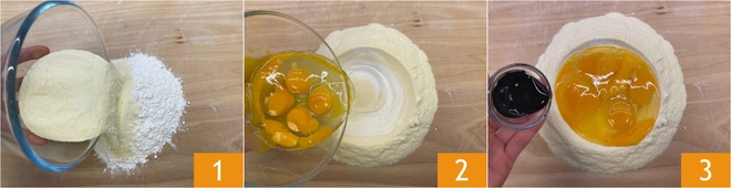 Pour préparer les spaghetti à la guitare à l'encre de seiche, moules et crevettes, commencez par les pâtes fraîches : sur un plan de travail, mélangez la farine 00 et la semoule 1. Formez une fontaine classique et versez au centre les œufs et le jaune 2. Ajoutez une pincée de sel et l'encre de seiche 3.