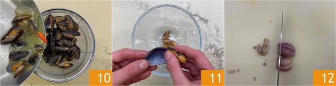Une fois ouvertes, filtrez 10 et conservez le liquide de cuisson. Retirez les coquilles et réservez 11. Épluchez l'échalote et émincez-la finement 12.
