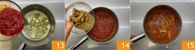 Dans une casserole, versez un filet d'huile, ajoutez l'échalote et faites-la étuver pendant quelques minutes. Versez la pulpe de tomate 13 et cuisez pendant 15 minutes. Ajoutez ensuite la moitié des moules 14 et laissez mijoter quelques minutes 15.