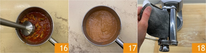 Mixez le tout avec un mixeur plongeant 16 jusqu'à obtenir une sauce lisse et homogène 17. Réservez. Étalez la pâte en feuilles de 2 mm d'épaisseur 18.